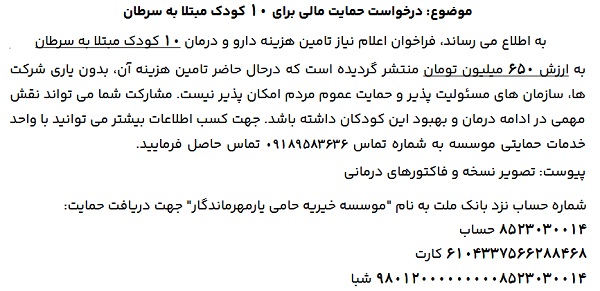 درخواست حمایت مالی، برای ۱۰ کودک مبتلا به سرطان ۰۷ بهمن ۱۴۰۴ | ۱۱:۳۳ کد : ۵۷۷۳۲ اطلاعیه ارسال به دیگران نام شما ایمیل شما ایمیل دریافتکننده ارسال انصراف تعداد بازدید:۹۹ موسسه خیریه حامی یار، درخواست حمایت مالی، برای ۱۰ کودک مبتلا به سرطان را دارد.