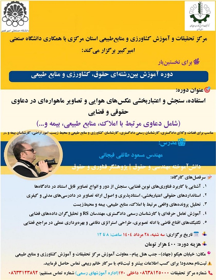 مرکز تحقیقات و آموزش کشاورزی و منابع طبیعی استان مرکزی، با عنایت به اهمیت آموزش، به ویژه آموزش های تخصصی برای کارشناسان این مرکز در نظر دارد با همکاری دانشگاه صنعتی امیر کبیر دوره آموزشی " استفاده، سنجش و اعتبار بخشی عکس های هوایی و تصاویر ماهواره ای در دعاوی حقوقی و قضایی (شامل دعاوی مرتبط با املاک، منابع طبیعی، بیمه و....) " را در تاریخ 28 مرداد 1404 برگزار نماید. این دوره از نوع بین رشته ای است و برای نخستین بار در استان برگزار می شود و مناسب برای قضات، وکلای دادگستری، کارشناسان رسمی دادگستری، کارشناسان کشاورزی و منابع طبیعی، محیط زیست، امور اراضی بیمه و سایر کارشناسان موضوعی می باشد.