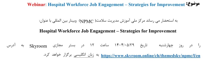 وبینار آموزشی بین المللی Hospital Workforce Job Engagement – Strategies for Improvement ۲۹ مرداد ۱۴۰۴ | ۱۰:۰۱ کد : ۵۳۹۲۵ اطلاعیه ارسال به دیگران نام شما ایمیل شما ایمیل دریافتکننده ارسال انصراف تعداد بازدید:۳۷۶ وبینار آموزشی بین المللی Hospital Workforce Job Engagement – Strategies for Improvement