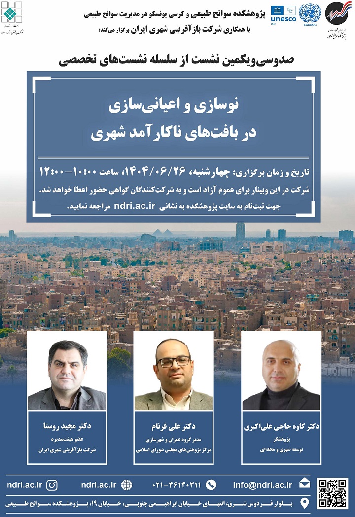 به اطلاع می رساند صدوسی و یکمین نشست از سلسله نشست های تخصصی با عنوان نوسازی و اعیانی سازی در بافت های ناکارآمد شهری، توسط پژوهشکده سوانح طبیعی و کرسی یونسکو، در مدیریت سوانح طبیعی و با همکاری شرکت بازآفرینی شهری ایران، به صورت برخط برگزار می گردد.شرکت در این وبینار برای عموم آزاد است و گواهی حضور به شرکت کنندگانی که در نشست ثبت نام کرده و حداقل نیمی از زمان برگزاری در وبینار حضور داشته باشند. اعطا خواهد شد.